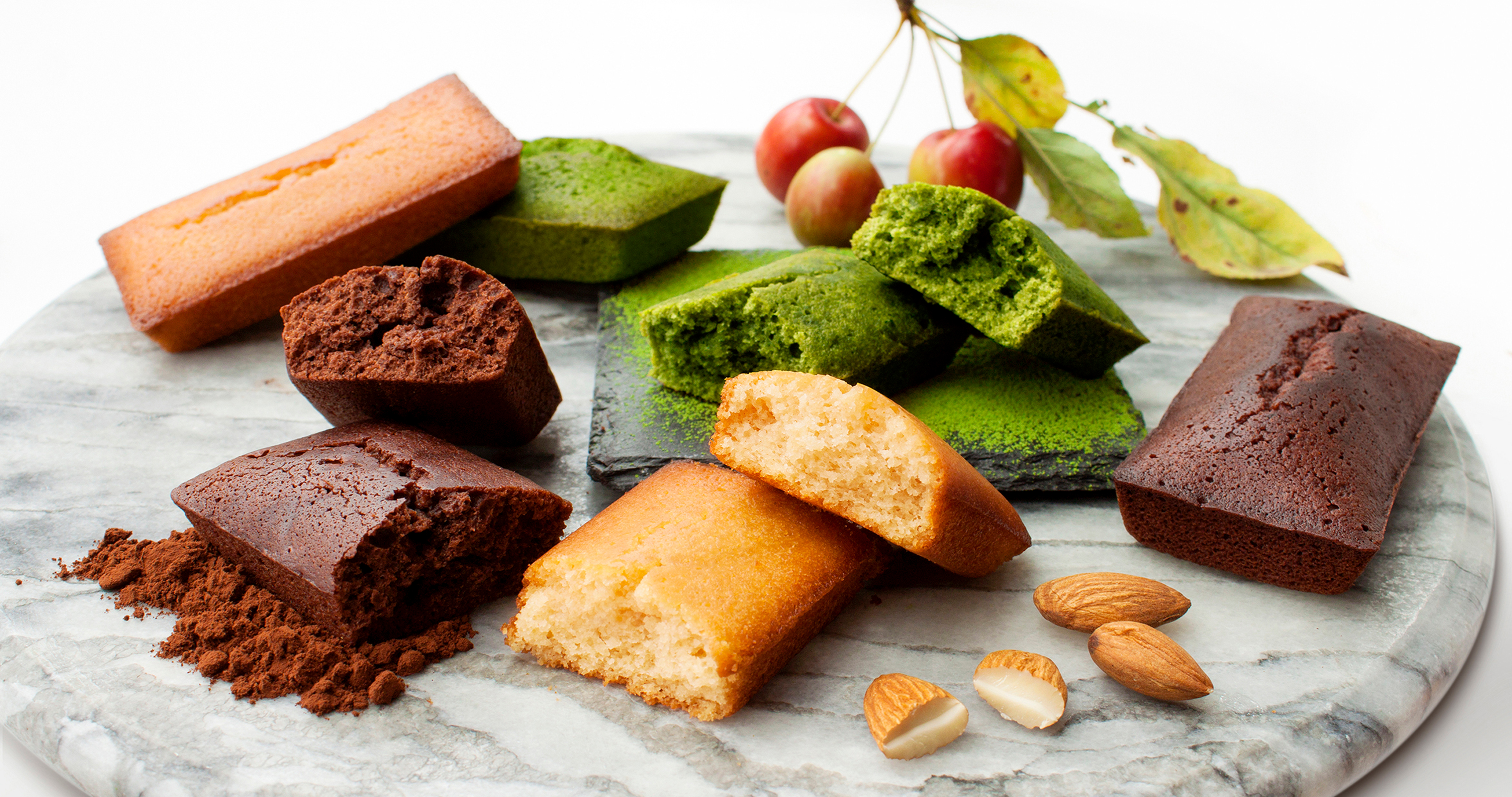 プレーン、ショコラ、抹茶、香り豊かな3つのフィナンシェをふんわりソフトに焼き上げました。